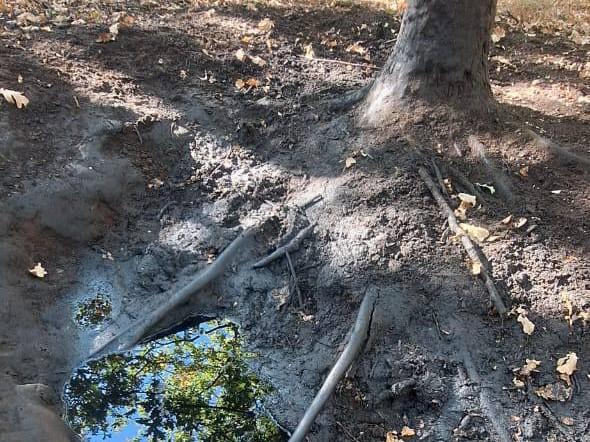 Разлитое моторное масло среди деревьев.