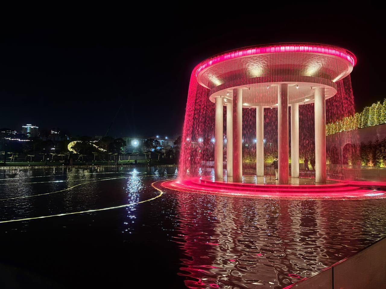 Купол фонтана-ротонды вечером освещается яркой динамической подсветкой.