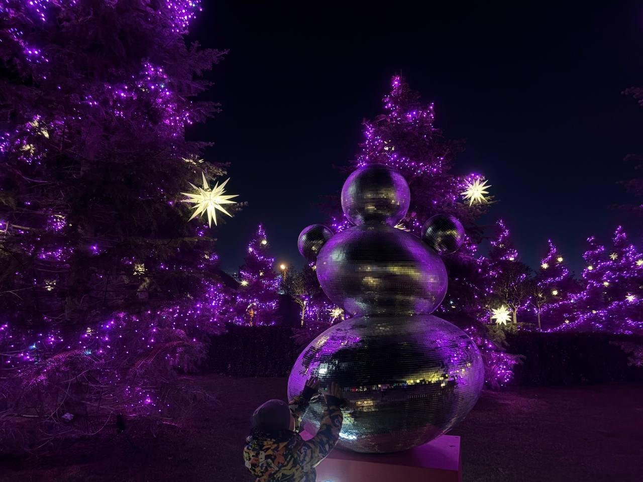 Среди сосен с фиолетовой подсветкой можно обнаружить концептуальную фигуру снеговика.