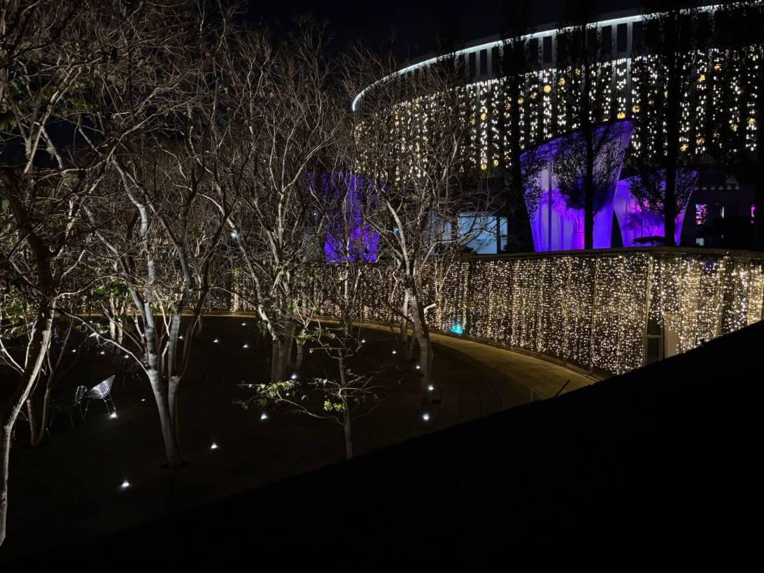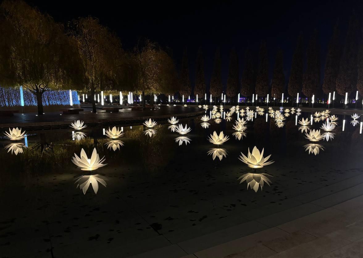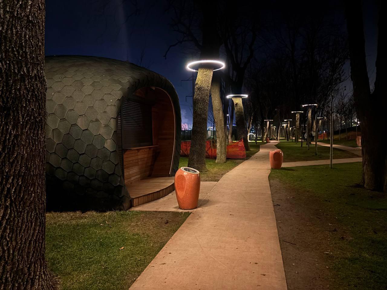 Необычные фонари плавно меняют цвета в ночное время.