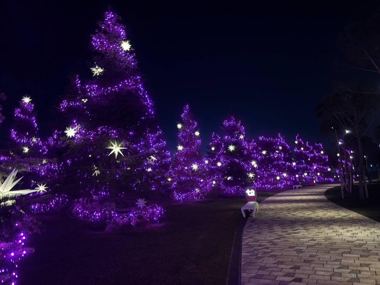 Фиолетовая подсветка охватывает целую аллею сосен.
