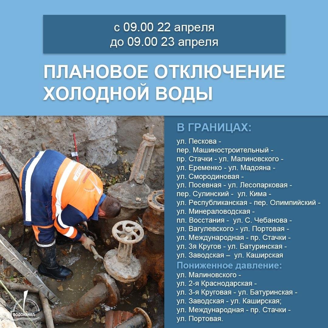 С утра 22 апреля в Западном жилмассиве Ростова запланировано отключение холодной воды на целые сутки. Информацию об этом распространил «Ростовводоканал».