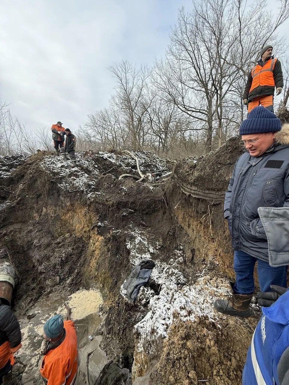 «Специалисты приступили к его устранению по технологической схеме: локализация, разрытие, демонтаж повреждённого участка трубы. Работы осложнены глубиной и погодными условиями, но ведутся непрерывно», — написала Пшеничная.