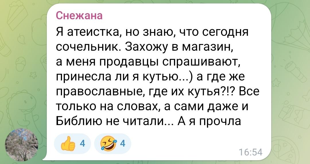 «Многие даже не знают, в честь чего и почему типа праздник. Просто знают, что кутью носить надо. Мой родственник — глубоко верующий, кандидат философских наук, и он каждый год стоит всю службу в соборе».