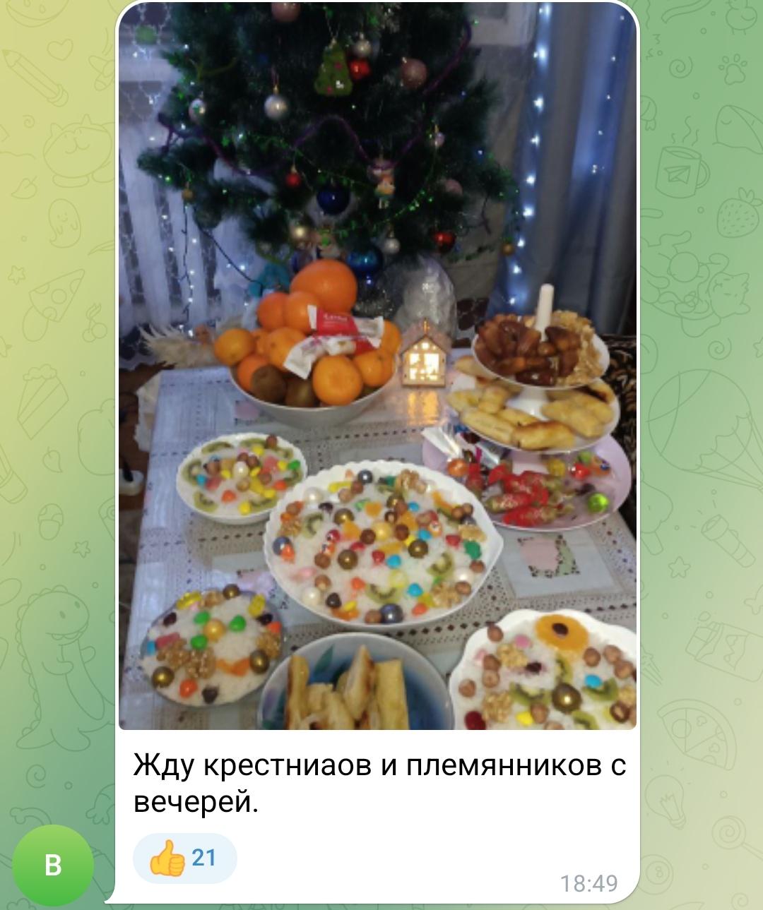 «Кутью из пшеницы с медом варим. В храм по возможности ходим, не каждый год получается. Вкусные блюда готовим, всех родных поздравляем, в детстве ходили по домам с рождественскими песнями и колядками по соседям. Кутью варили много, чтобы приходящие к нам в дом люди тоже откушали».