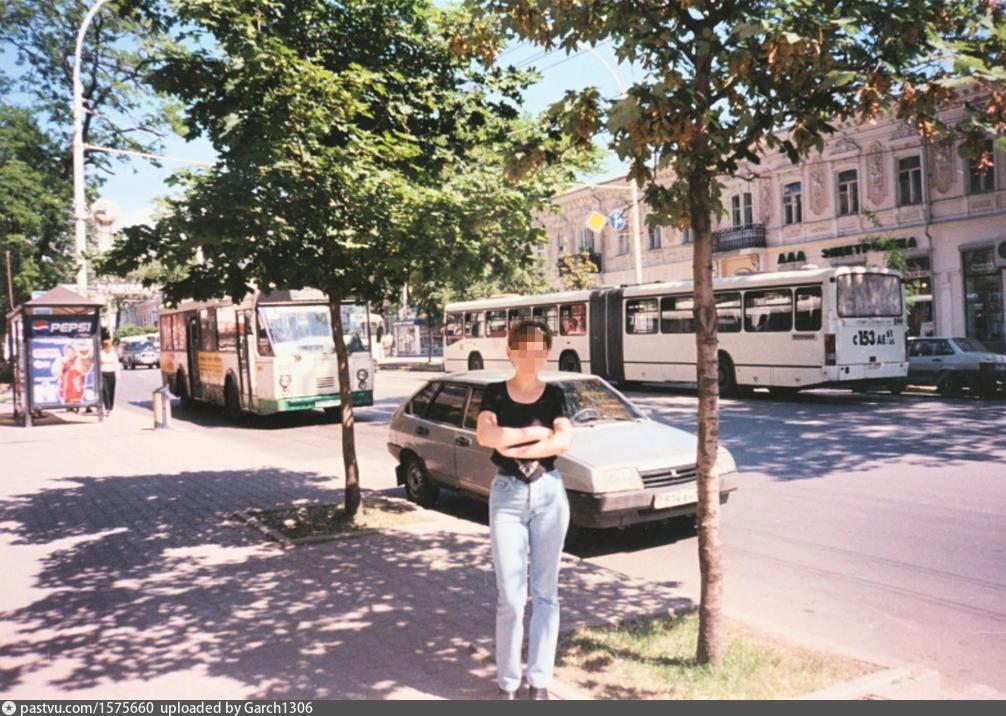 Примерно 1998 год. Большая Садовая улица у дома №81. В кадре — два автобуса того времени, причём белый является сочленённой моделью («гармошкой»).