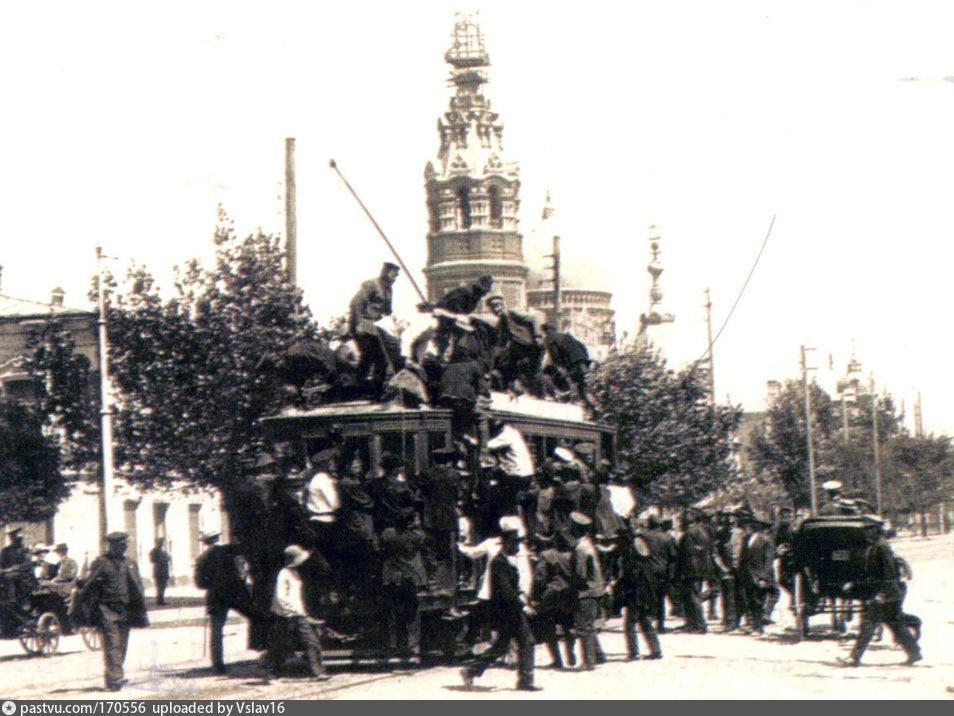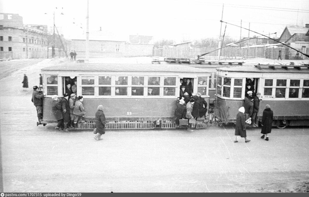 Снято в том же месте, что и предыдущее фото. Транспорт переполнен пассажирами, что напоминает ситуацию 2026 года. Сегодня лишь редко можно увидеть «зацеперов» на задней площадке.