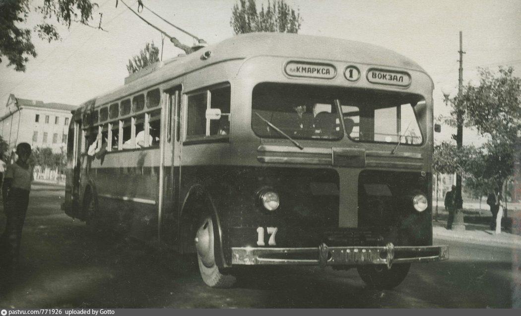 1947 год. Троллейбус движется по Большой Садовой, которая в тот период носила название улицы Энгельса.